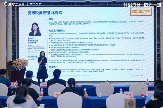出席此次活动的相嘉宾有:金蝶软件(中国)有限公司 肖祥铁先生、金蝶中国中型企业事业部解决方案部专家陈勇先生、金蝶东莞中型分销负责人明哲先生、毕马威税务合伙人:钟国华先生、毕马威企业咨询(中国)有限公司税务总监麦慧琳女士、毕马威企业咨询(中国)有限公司高级税务经理林秀玲女士、东莞市恒企教育有限公司黄敏婷女士、东莞市鑫扬家居用品有限公司魏留杰女士、东莞市创友软件有限公司总经理万伟平先生